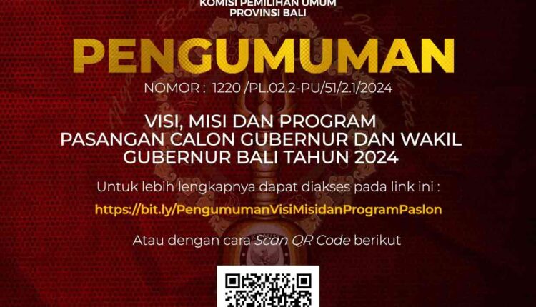 Dalam rangka mewujudkan keterbukaan informasi serta mendorong partisipasi masyarakat dalam tahapan pencalonan pada Pemilihan Gubernur dan Wakil Gubernur Bali Tahun 2024, Komisi Pemilihan Umum Provinsi Bali mengumumkan visi, misi dan program Pasangan Calon Gubernur dan Wakil Gubernur Bali Tahun 2024 yang dapat diakses pada tautan https://bit.ly/PengumumanVisiMisidanProgramPaslon.
