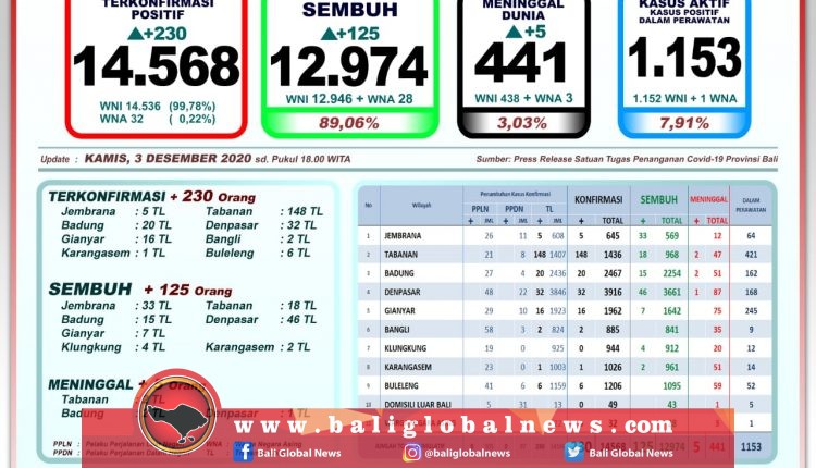 Perkembangan pandemi Covid-19 di Provinsi Bali pada Kamis (3/12) terkonfirmasi 230 orang melalui transmisi lokal, sembuh 125 orang dan 5 orang meninggal dunia.