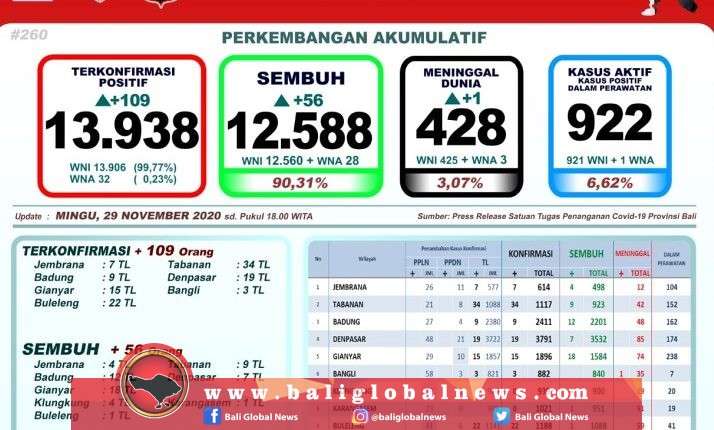 Update Covid-19 Bali 29 November, Ada Pertambahan Pasien Positif 109 Kasus, Sembuh 56 dan Meninggal 1 Orang