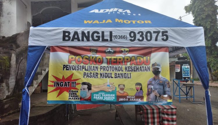 Dalam upaya mendisiplinkan masyarakat terkait protokol kesehatan dan adaptasi kebiasaan baru di Pasar Kidul, Polsek Bangli bersama Polres Bangli mendirikan dua posko terpadu, Minggu (19/7).