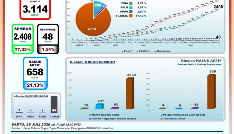 Gugus Tugas Percepatan Penanganan Covid-19 Provinsi Bali mencata penderita terkomfirmasi positif Covid-19 Sabtu (25/7) bertambah 56 orang, terdiri atas 53 transmisi lokal dan 3 PPDN. Dengan demikian hingga hari ini jumlah kumulatif pasien positif 3.114 orang.