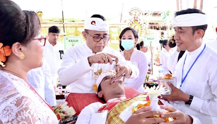 Walikota Denpasar, I Gusti Ngurah Jaya Negara ngayah “nyangging” serangkaian karya atma wedana dan mepandes kinambulan yang digelar untuk keenam kalinya oleh Desa Adat Sesetan, Kecamatan Denpasar Selatan, di Pemelisan Desa Adat Sesetan, pada Kamis (18/7/2024).