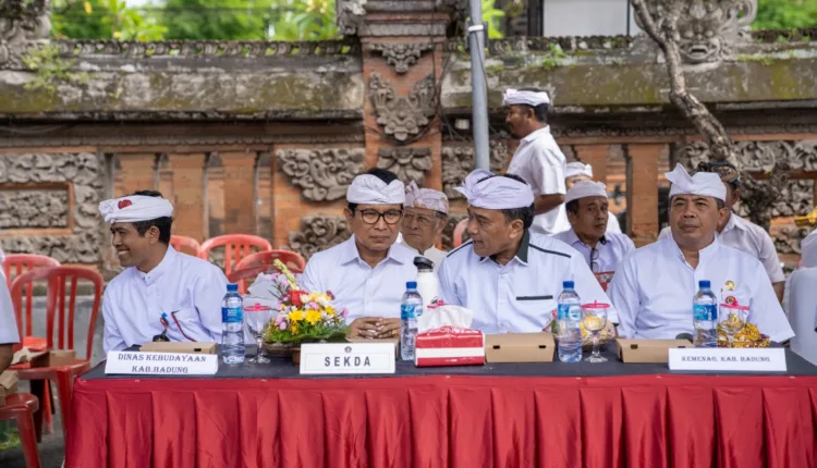 Anggota DPRD Badung, l Nyoman Wiradana, mendampingi Sekretaris Daerah Kabupaten Badung l Wayan Adi Arnawa menghadiri karya mapepada di Pura Bale Agung, Desa Sibanggede, Abiansemal Badung, Selasa (4/6/2024).