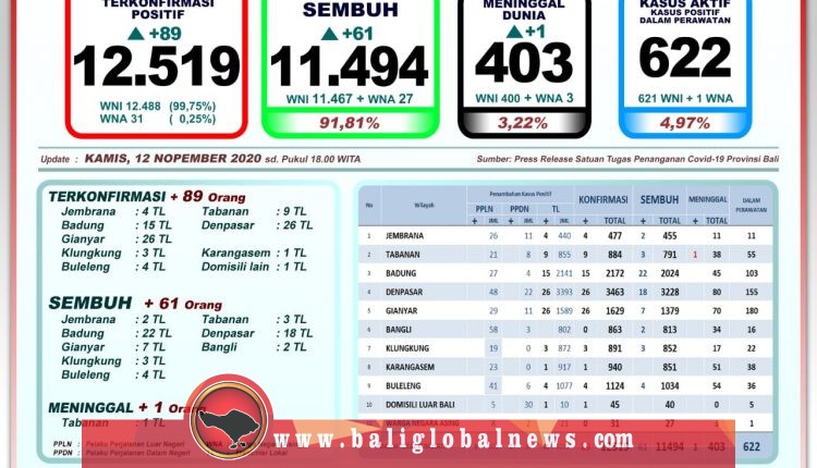 Perkembangan pandemi Covid-19 di Provinsi Bali pada Kamis (12/11) terkonfirmasi 89 orang melalui transmisi lokal, sembuh 61 orang, dan 1 orang meninggal dunia.
