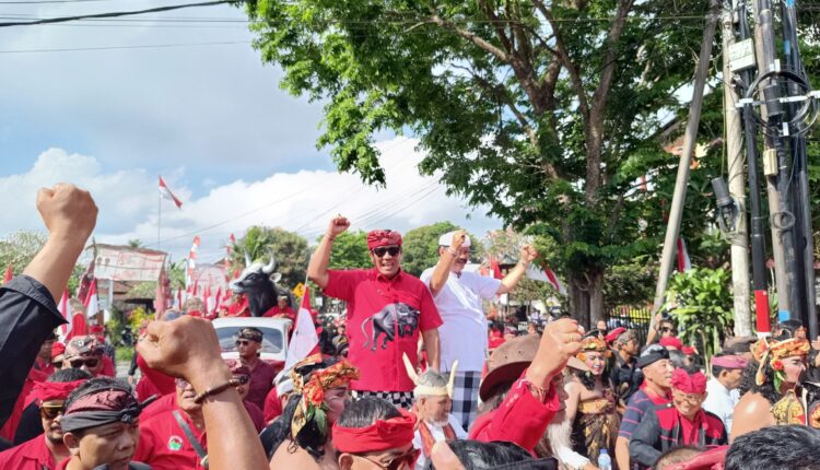 Selanjutnya, di belakang para penari tampak belasan satgas PDIP membawa bendera partai politik (Parpol) pengusung Sanjaya-Dirga dan bendera merah putih. Sedangkan di belakang barisan itu tampak Sanjaya-Dirga diantar mobil jeep terbuka