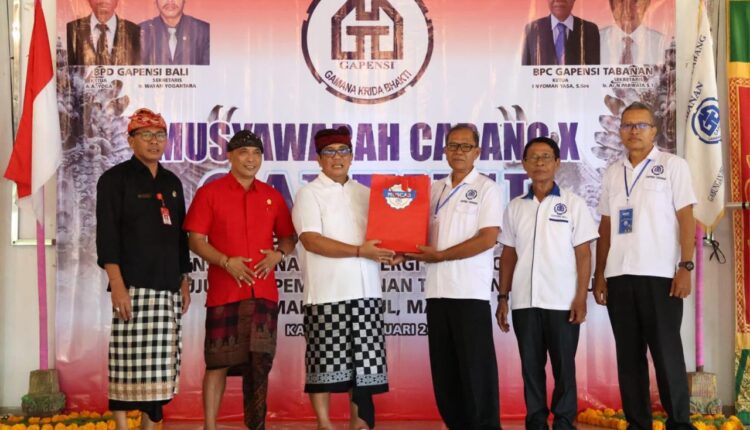 Musyawarah Cabang (Muscab) X Gabungan Pelaksana Konstruksi Nasional Indonesia (Gapensi) Tabanan resmi dibuka oleh Bupati Tabanan I Komang Gede Sanjaya di Warung Taman Alas Permata Sari Buruan, Penebel, Tabanan, pada Kamis (30/1/2025).
