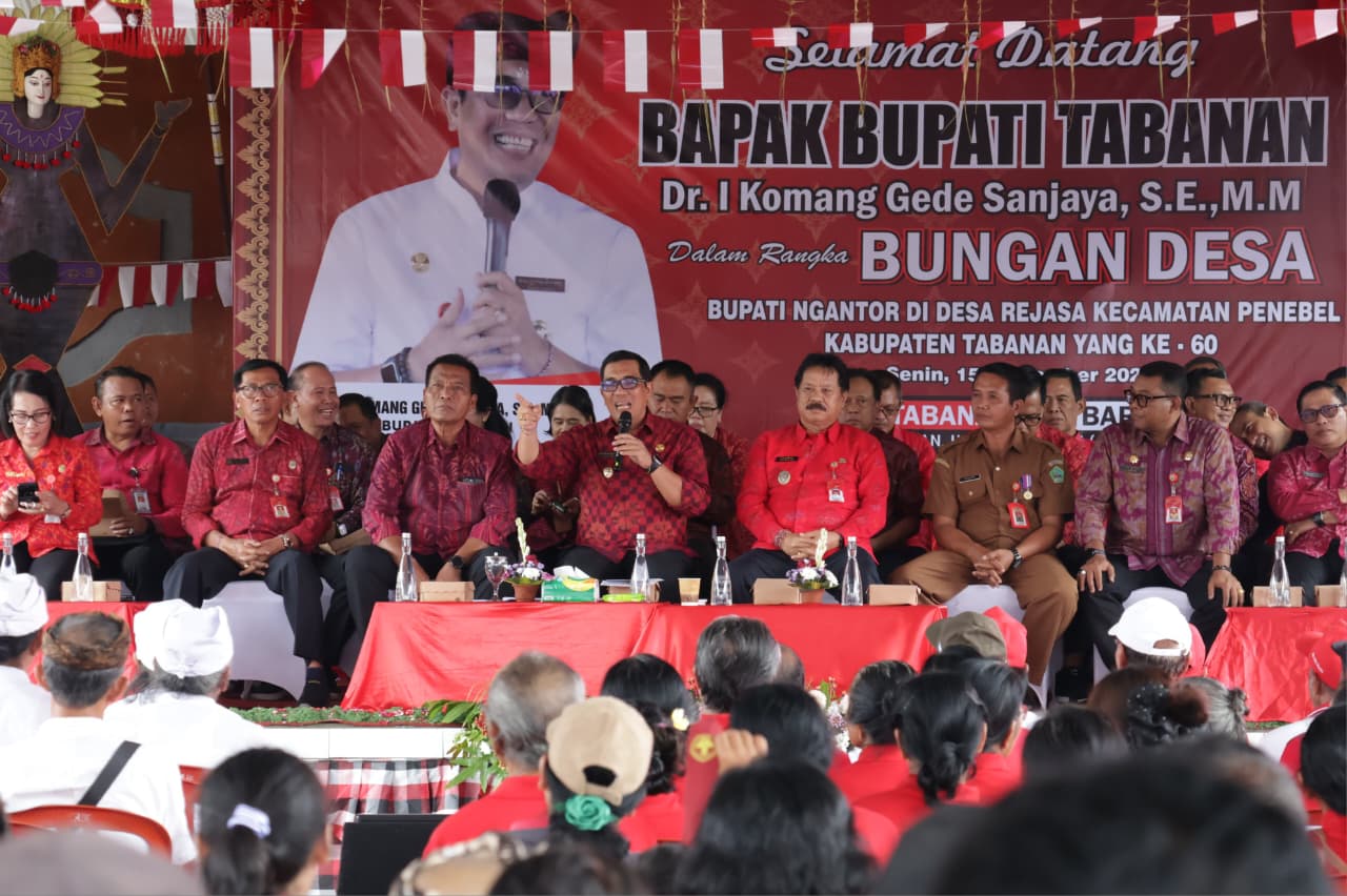 Bupati Tabanan I Komang Gede Sanjaya kembali melaksanakan program andalannya, “Bungan Desa”, Bupati Ngantor di Desa. Kali ini berlangsung di Desa Rejasa, Kecamatan Penebel, pada Senin (15/9/2025). Program yang sudah memasuki desa ke-60 ini disambut penuh antusias oleh masyarakat setempat.