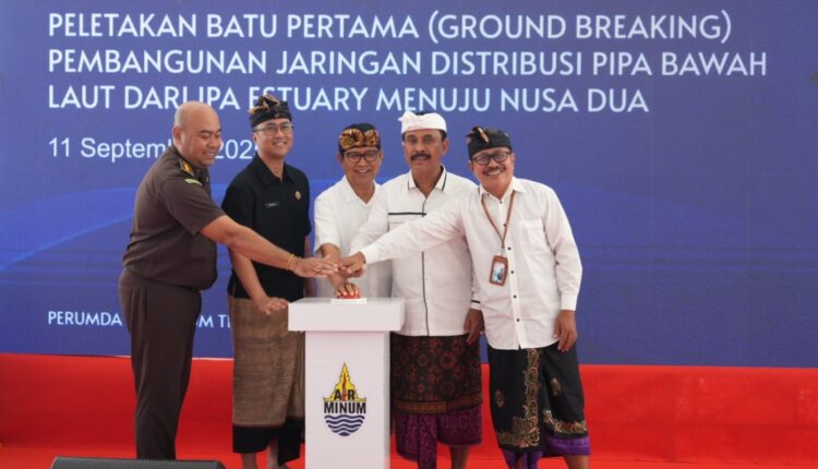Bupati Badung I Wayan Adi Arnawa meletakkan batu pertama pembangunan jaringan distribusi pipa bawah laut dari Instalasi Pengolahan Air (IPA) Estuary menuju Nusa Dua di IPA Estuary, Perusahaan Umum Daerah (Perumda) Air Minum Tirta Mangutama Kabupaten Badung, Jalan By-pass Ngurah Rai, Suwung, pada Kamis (11/9/2025).