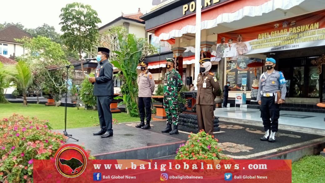 Bupati Bangli, Sang Nyoman Sedana Arta menjadi Irup pada apel gelar Pasukan Operasi Aman Nusa Agung II Penanganan Covid-19 tahun 2021 lanjutan di halaman Polres Bangli, Sabtu (3/7).Bupati Bangli yang membacakan sambutanya Kapolda Bali mengapresiasi seluruh personil yang tergabung dalam operasi tersebut yang memiliki tekad yang kuat sebagai abdi negara untuk memberikan pengayom dan pelayanan masyarakat. Beberapa hari terakhir ini perkembangan Covid-19 berkembang sangat cepat dengan varian baru yang menjadi persoalan serius. Adapun langkah langkah yang lebih tegas agar kita dapat membendung penyebaran Covid-19 pemberlakuan PPKM darurat merupakan salah satu kebijakan pemerintah, khusus Pulau Jawa dan Bali.PPKM darurat, kata dia, meliputi pembatasan aktivitas masyarakat yang lebih ketat daripada sebelumnya. Penerapan PPKM darurat dilaksanakan dari pada 3 – 20 Juli dengan target penurunan Covid- 19 yang konfirmasi positif kurang dari 10 ribu kasus per hari secara nasional.PPKM darurat, lanjutnya, dilaksanakan di seluruh kota, kabupaten di Provinsi Bali, dengan harapan ke depan penerapan PPKM darurat bisa menunjukkan perubahan yang efektif. Tentu harus disadari bahwa keselamatan masyarakat merupakan hukum tertinggi.Sedana Arta juga mengatakan untuk kab bangli juga menerapkan PPKM darurat sesuai dengan Surat Edaran Gubernur No. 09 tahun 2021 yang penerapan pembatasan kegiatan di antaranya:pada sektor non-esensial diberlakukan 100 persen, pendidikan berjenjang secara online. Sektor esensial diberlakukan 50 persen maksimal work from office, sektor kritikal diberlakukan 50 persen work from office. untuk pasar, supermarket kapasitas pengunjung 50 persen. Jam operasional sampai dengan pukul 20.00, fasilitas umum, pusat perbelanjaan tempat ibadah, dan kegiatan seni ditutup.Bupati juga menegaskan agar seluruh krama Bangli mematuhi SE Gubernur untuk menekan penyebaran Covid-19,varian baru semaksimal mungkin.Turut hadir pada acara tersebut Kapolres Bangli, Dandim 1626 Bangli, Kejaksaan Negeri Bangli serta anggota Polres Bangli, Satpol PP, Dinas Perhubungan dan undangan lainnya. (bgn003)21070325