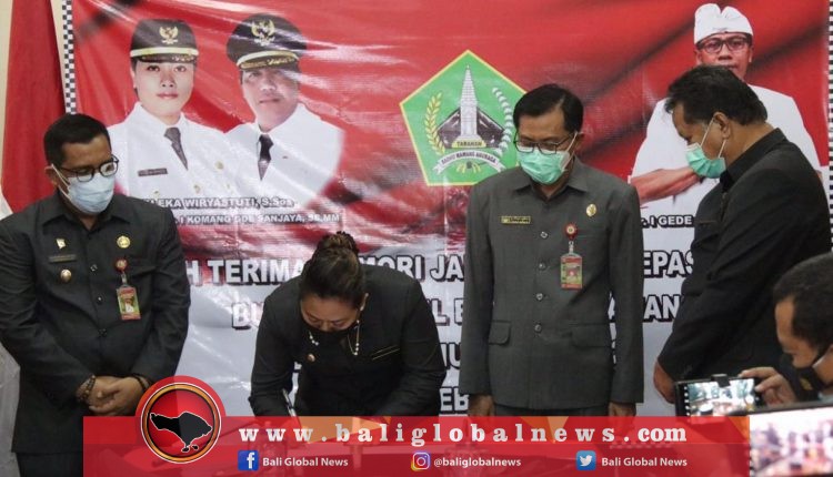 Bupati Tabanan, Ni Putu Eka Wiryastuti dan Wakil Bupati Tabanan, I Komang Gede Sanjaya, secara resmi menyerahkan jabatan kepada Plh. Bupati Tabanan, Sekretaris Daerah Kabupaten Tabanan, I Gede Susila, Rabu (17/2).