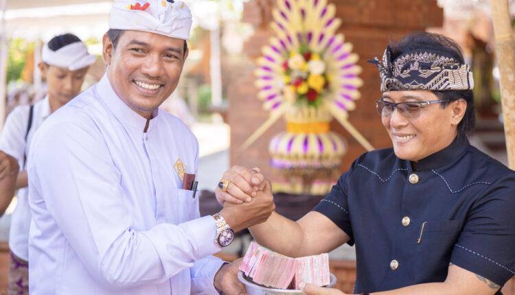 Bupati Badung I Nyoman Giri Prasta menghadiri upacara melaspas, mendem pedagingan dan mecaru Wantilan Pura Agung Petilan. Desa Adat Kesiman, Denpasar, pada Sabtu (14/9/2024). Sebagai wujud perhatian dan dukungan, Bupati Giri Prasta menyerahkan punia secara pribadi Rp100 juta.