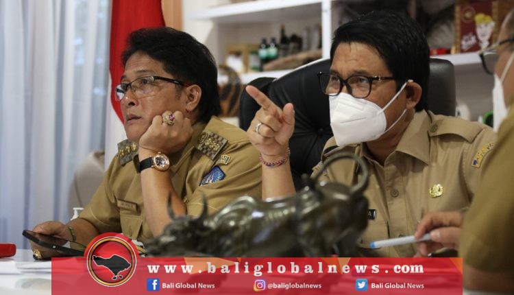 Bupati Badung, Nyoman Giri Prasta, mengikuti rapat evaluasi penyerapan anggaran daerah tahun 2021 secara virtual dari ruang kerja Bupati Badung, Senin (22/11). Bupati didampingi Sekda Wayan Adi Arnawa, Kepala Bappeda Made Wira Dharmajaya dan Inspektur sekaligus Plt. BPKAD Luh Suryaniti.