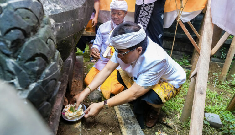 Bupati Badung I Nyoman Giri Prasta menghadiri upacara mendem pedagingan di Pura Puseh Buangga, Desa Adat Getasan, Desa Getasan, Kecamatan Petang, Badung, pada Minggu (24/11/2024). Upacara tersebut serangkaian karya ngenteg linggih padudusan agung, mupuk pedagingan, meresi gana medasar tawur balik sumpah, menawa ratna, mapedanan, dan mekebat daun serta bangun ayu, yang puncaknya pada Rabu (4/12/2024).