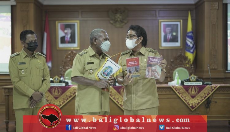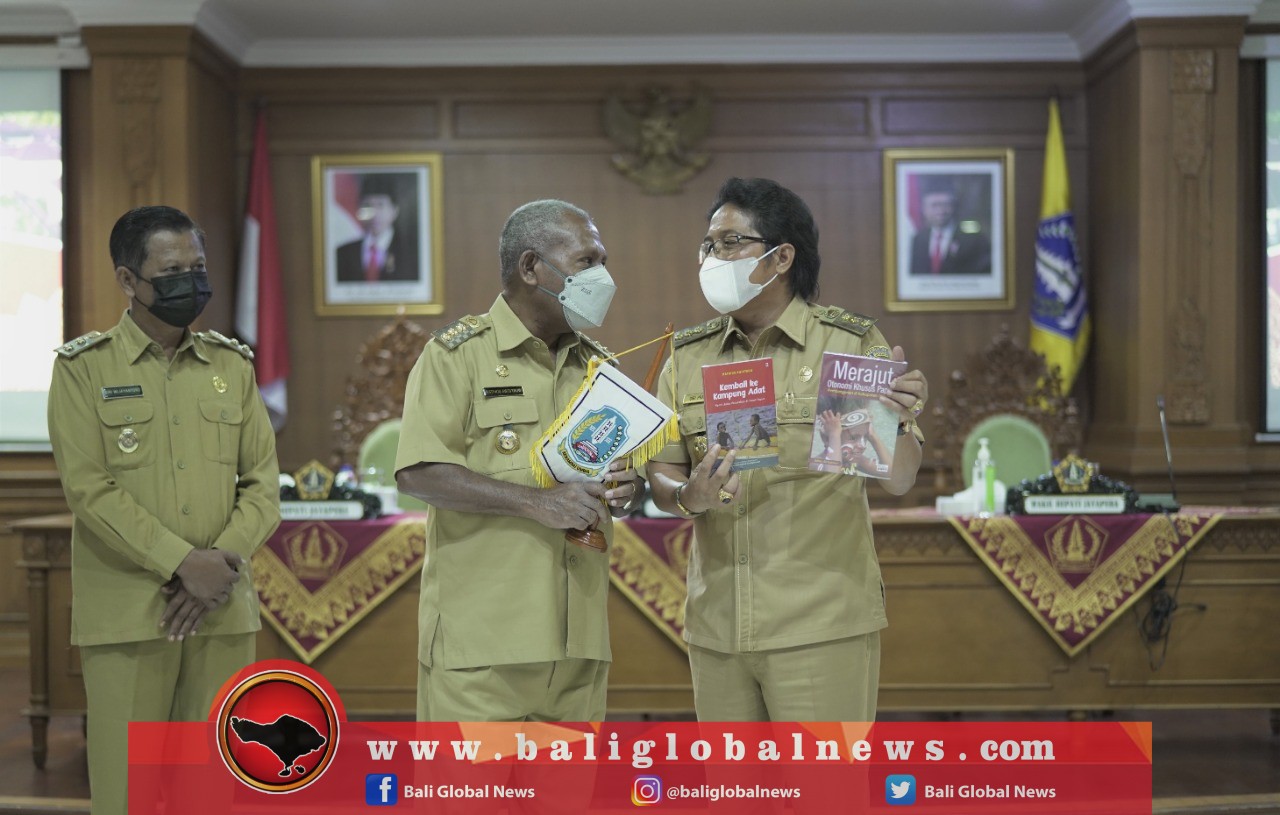 Bupati Badung, I Nyoman Giri Prasta, menerima kunjungan kaji banding Bupati Kabupaten Jayapura Provinsi Papua, Mathius Awoitauw dan Wakil Bupati Giri Wijayantoro beserta jajaran terkait Penyempurnaan Penyusunan Rancangan Peraturan Daerah (Raperda) tentang Retribusi Persetujuan Bangunan Gedung di Ruang Kriya Gosana, Puspem Badung, pada Senin (18/4).