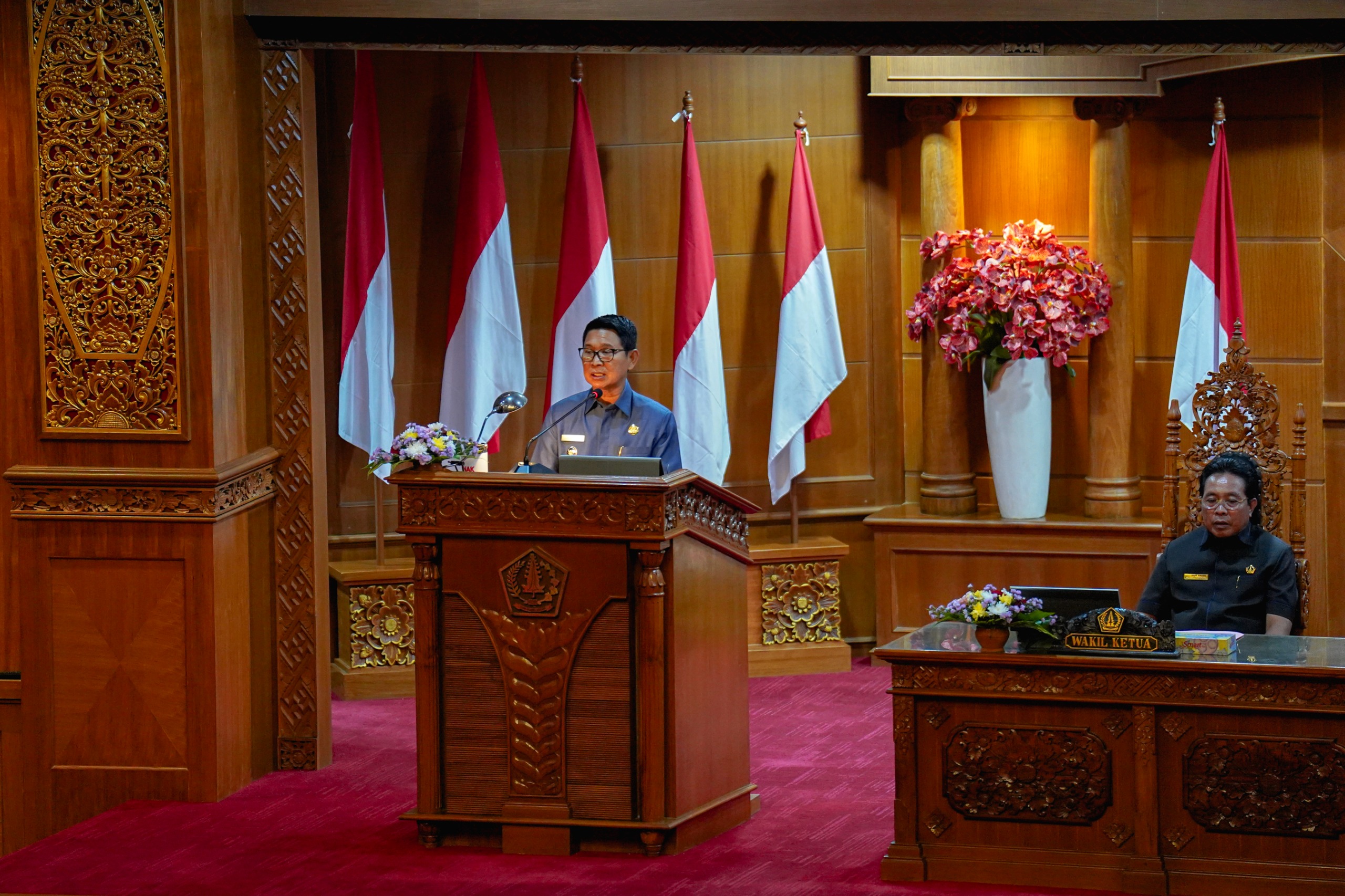 Bupati Badung I Wayan Adi Arnawa menyampaikan Jawaban Pemerintah terhadap Pemandangan Umum (PU) Fraksi-fraksi DPRD Badung terkait dua dokumen Rancangan Peraturan Daerah (Raperda) yaitu Raperda tentang APBD Tahun Anggaran 2026 dan Raperda tentang Pemberian Insentif dan/atau Kemudahan Penanaman Modal dalam Rapat Paripurna DPRD Badung di Ruang Sidang Utama Gosana, Sekretariat DPRD Badung, pada Jumat (7/11/2025). Rapat paripurna yang dipimpin Ketua DPRD Badung I Gusti Anom Gumanti tersebut juga membahas dua Raperda Inisiatif DPRD yaitu Raperda tentang Perlindungan dan Penertiban Hewan Penular Rabies dan Raperda Fasilitas Perlindungan Kekayaan Intelektual. Rapat dihadiri Pimpinan dan anggota DPRD Badung, Forkopimda, Pimpinan Perangkat Daerah serta Pimpinan Instansi Vertikal.