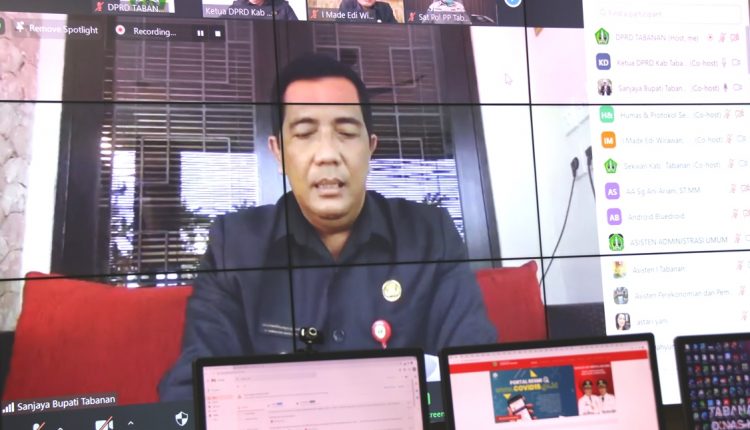 Sidang paripurna dipimpin oleh Ketua DPRD Tabanan, I Made Dirga, didampingi para Wakil Ketua, yang dilaksanakan secara teleconference melalui aplikasi zoom meeting.