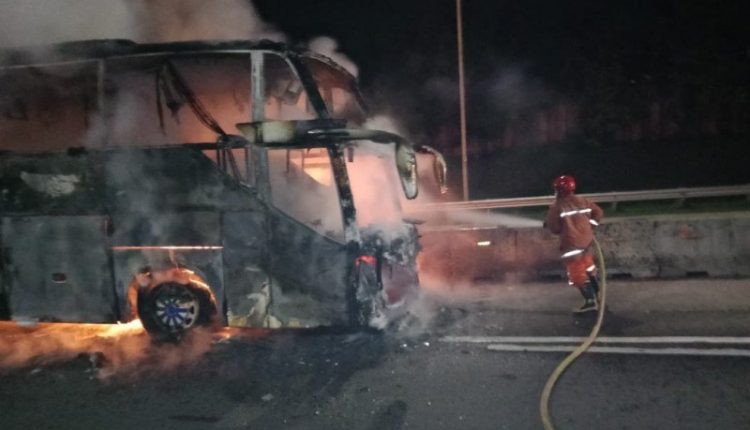 Bus bernomor polisi AD 1422 EF milik Perusahaan Otobus (PO) Sinar Jaya itu terbakar di lajur lambat arah Bogor, Jawa Barat.