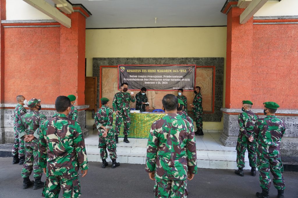 Selesai pelaksanaan sosialisasi seluruh personel melaksanakan tes urine yang dipimpin oleh Perwira Seksi Penyelidikan Dan Pengamanan Staf Intel Korem 163/Wira Satya Mayor Inf I Wayan Notes.