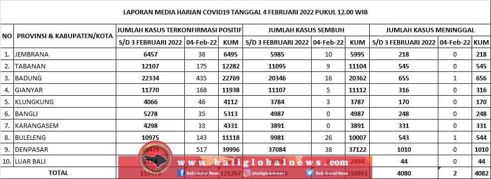 Pertambahan kasus terkonfirmasi positif Covid-19 di Provinsi Bali pada Jumat (4/2) tercatat 1.789 orang, pasien sembuh 115 dan 2 meninggal dunia.