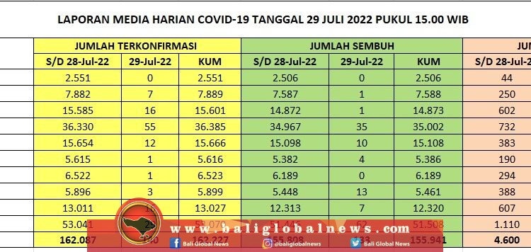 Pertambahan kasus terkonfirmasi positif Covid-19 di Provinsi Bali pada Jumat (29/7) tercatat 140 orang, pasien sembuh 133 dan 5 orang meninggal dunia.