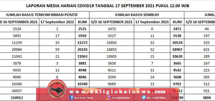 Atas perkembangan kasus tersebut, sesuai rilis Satgas Nasional total positif Covid-19 di Provinsi Bali hingga kini menjadi 111.130 orang, sembuh mencapai 104.790 orang, dan meninggal dunia menjadi 3.817 orang.