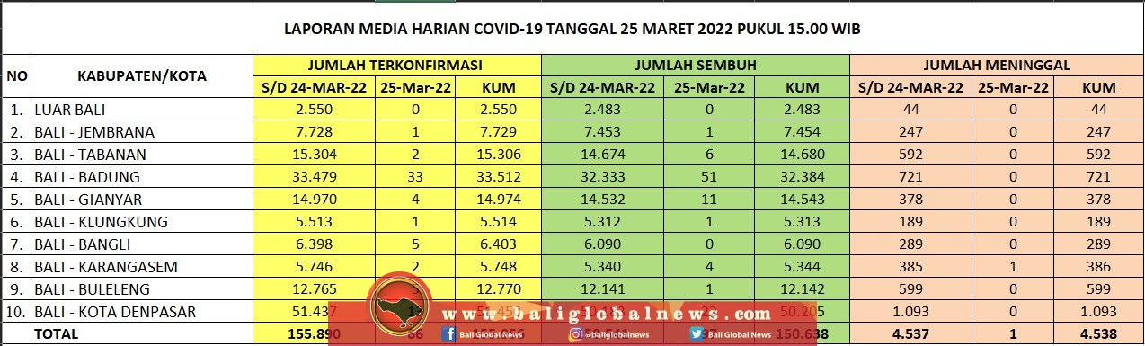 Pertambahan kasus terkonfirmasi positif Covid-19 di Provinsi Bali pada Jumat (25/3) tercatat 66 orang, pasien sembuh 97 dan 1 meninggal dunia.