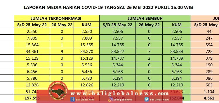 Pertambahan kasus terkonfirmasi positif Covid-19 di Provinsi Bali pada Kamis (26/5) tercatat 12 orang, pasien sembuh 9 dan nihil meninggal dunia.