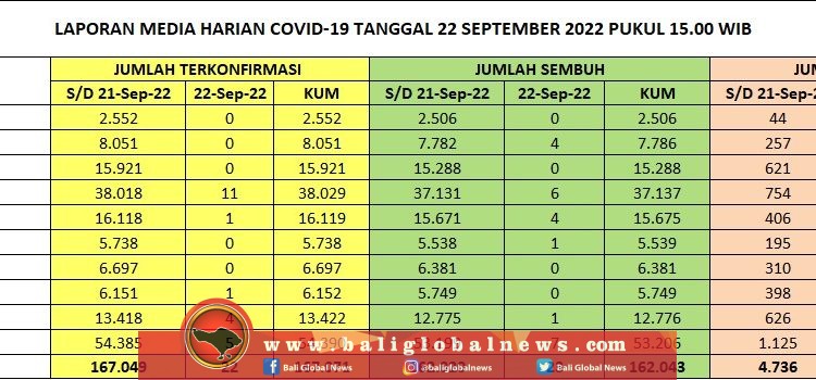 Pertambahan kasus terkonfirmasi positif Covid-19 di Provinsi Bali pada Kamis (22/9/2022) tercatat 22