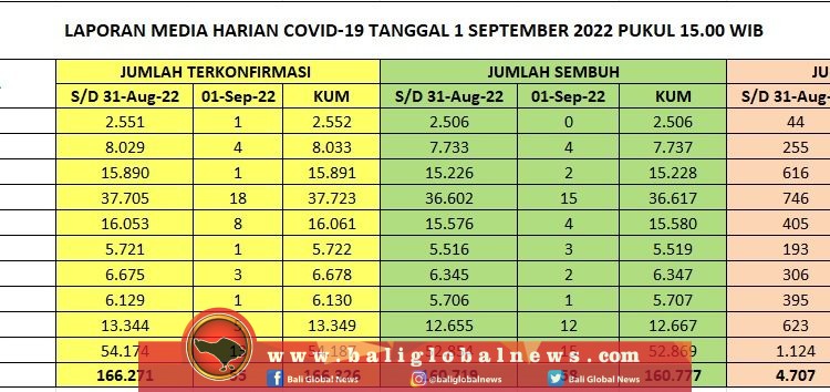 Pertambahan kasus terkonfirmasi positif Covid-19 di Provinsi Bali pada Kamis (1/9/2022) tercatat 55 orang, pasien sembuh 58 dan 1 orang meninggal dunia.