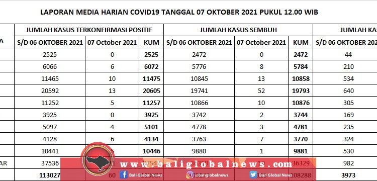 Pertambahan kasus terkonfirmasi positif Covid-19 di Provinsi Bali pada Kamis (7/10) tercatat 60 orang, pasien sembuh 115 orang dan 4 pasien meninggal dunia.