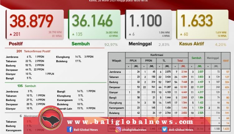Pertambahan kasus Covid-19 di Provinsi Bali pada Kamis (25/3) terkonfirmasi 201 orang (170 orang melalui transmisi lokal, 30 PPDN dan 1 PPLN), sembuh 135 orang, dan 6 orang meninggal dunia.