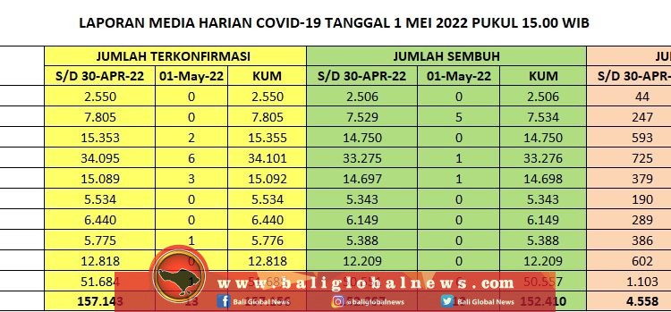 Pertambahan kasus terkonfirmasi positif Covid-19 di Provinsi Bali pada Minggu (1/5) tercatat 13 orang, pasien sembuh 13 dan 1 meninggal dunia.