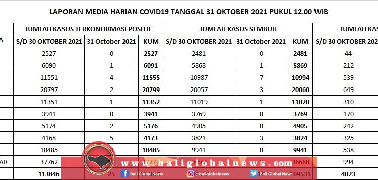 Pertambahan kasus terkonfirmasi positif Covid-19 di Provinsi Bali pada Minggu (31/10) tercatat 25 orang, pasien sembuh 18 orang dan 3 pasien meninggal dunia.