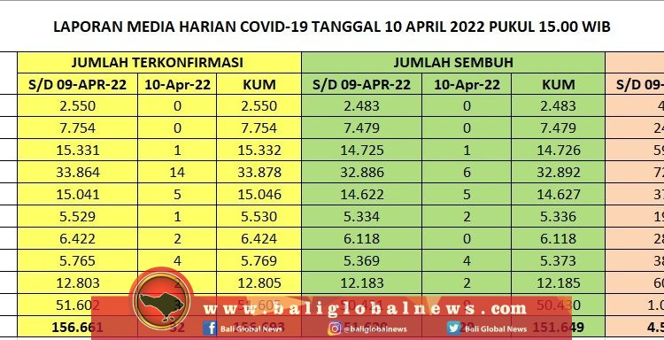 Pertambahan kasus terkonfirmasi positif Covid-19 di Provinsi Bali pada Minggu (10/4) tercatat 32 orang, pasien sembuh 29 dan nihil meninggal dunia.