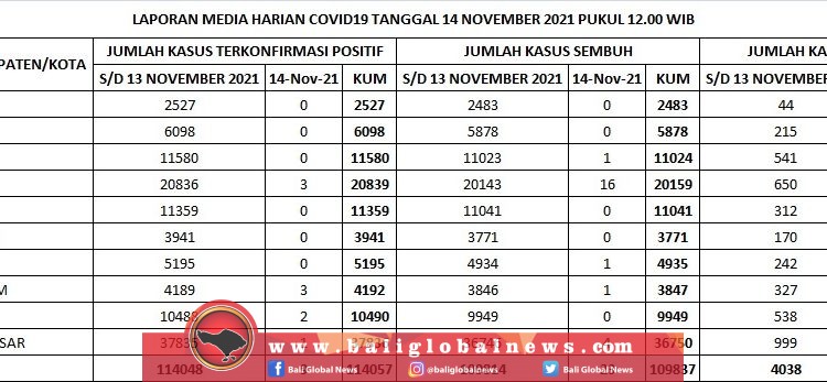 Pertambahan kasus terkonfirmasi positif Covid-19 di Provinsi Bali pada Minggu (14/11) tercatat 9 orang, pasien sembuh 23 orang dan nihil pasien meninggal dunia.