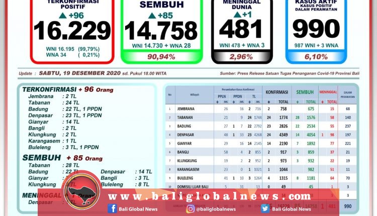 Perkembangan pandemi Covid-19 di Provinsi Bali pada Sabtu (19/12) tercatat  terkonfirmasi 96 orang (93 orang melalui transmisi lokal dan 3 PPDN), sembuh 85 orang, dan 1 orang meninggal dunia.