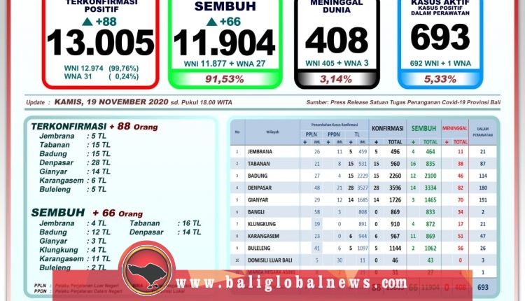 Perkembangan pandemi Covid-19 di Provinsi Bali pada Kamis (19/11) terkonfirmasi 88 orang melalui transmisi lokal, sembuh 66 orang, dan nihil meninggal dunia.