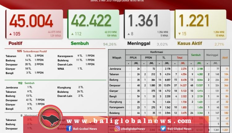 Pertambahan kasus terkonfirmasi positif di Provinsi Bali pada Senin (3/5) tercatat 105 orang (96 orang melalui transmisi lokal dan 9 PPDN), sembuh 112 orang, dan 8 orang meninggal dunia.