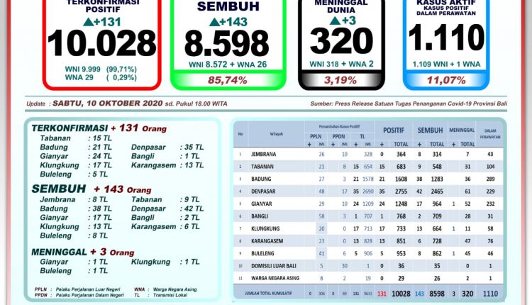 Perkembangan pandemi Covid-19 di Provinsi Bali pada Sabtu (10/10) terkonfirmasi 131 orang melalui transmisi lokal, sembuh 143 orang, dan meninggal dunia 3 orang. Secara kumulatif terkonfirmasi positif 10.028 orang, sembuh 8.598 orang (85,74%) dan meninggal sunia 320 orang (3,19%).