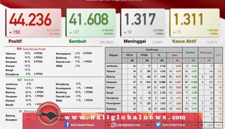 Pertambahan kasus Covid-19 di Provinsi Bali pada Selasa (27/4) terkonfirmasi 150 orang (127 orang melalui transmisi lokal dan 23 PPDN), sembuh 127 orang, dan 10 orang meninggal dunia.