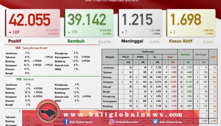 Pertambahan kasus terkonfirmasi positif Covid-19 di Provinsi Bali pada Senin (12/4) tercatat 169 orang (159 orang melalui transmisi lokal, 8 PPDN dan 2 PPLN) sembuh 159 orang, dan 7 orang meninggal dunia.