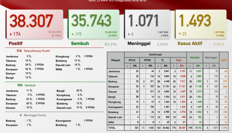 Pertambahan kasus Covid-19 di Provinsi Bali pada Senin (22/3) terkonfirmasi 174 orang (163 orang melalui transmisi lokal dan 11 PPDN),sembuh 195 orang, dan 4 orang meninggal dunia.