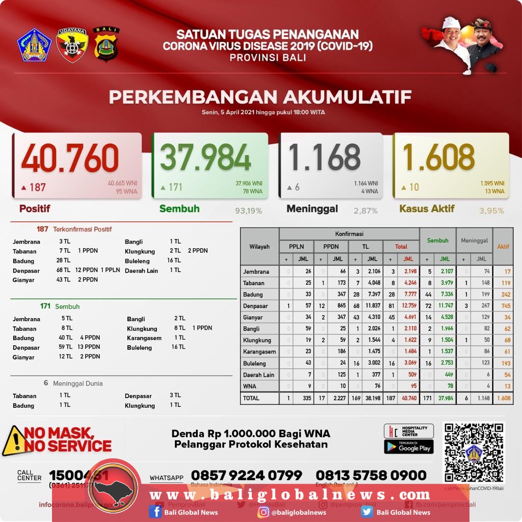 Pertambahan kasus terkonfirmasi positif di Provinsi Bali pada Senin (5/4) tercatat 187 orang (169 orang melalui transmisi lokal, 17 PPDN dan 1 PPLN) sembuh 171 orang, dan 6 orang meninggal dunia.