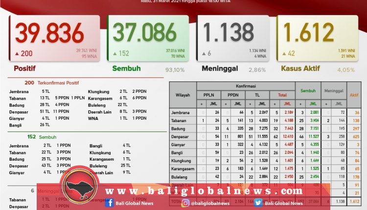 Pertambahan kasus Covid-19 di Provinsi Bali pada Rabu (31/3) terkonfirmasi 200 orang (166 orang melalui transmisi lokal, 33 PPDN dan 1 PPLN), sembuh 152 orang, dan 6 orang meninggal dunia.