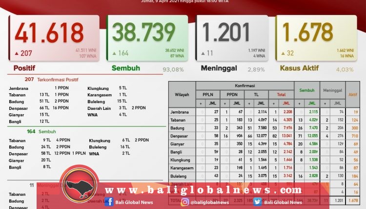 Pertambahan kasus terkonfirmasi positif di Provinsi Bali pada Jumat (9/4) 207 orang (185 orang melalui transmisi lokal dan 22 PPDN), sembuh 164 orang, dan 11 orang meninggal dunia.