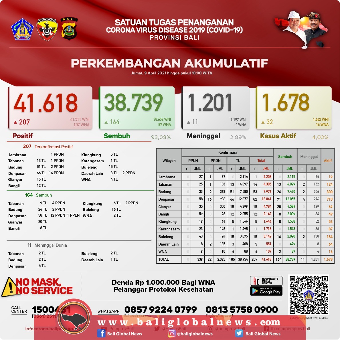 Pertambahan kasus terkonfirmasi positif di Provinsi Bali pada Jumat (9/4) 207 orang (185 orang melalui transmisi lokal dan 22 PPDN), sembuh 164 orang, dan 11 orang meninggal dunia.