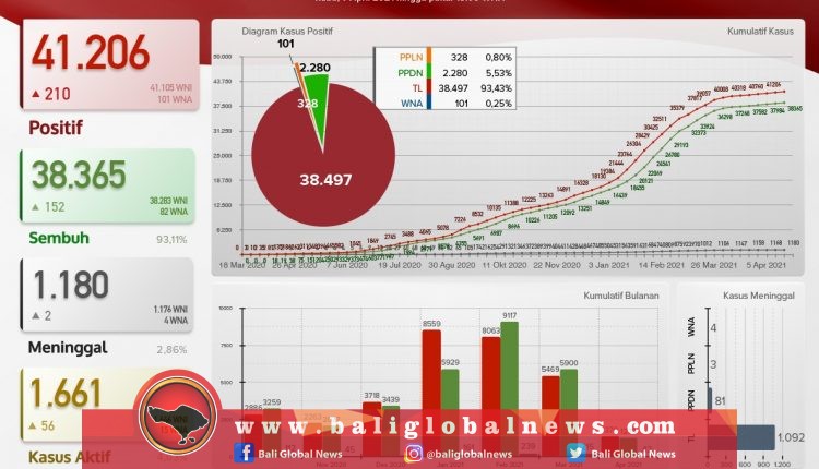 Pertambahan kasus terkonfirmasi positif Covid-19 di Provinsi Bali pada Rabu (7/4) tercatat 210 orang (182 orang melalui transmisi lokal dan 28 PPDN), sembuh 152 orang, dan 2 orang meninggal dunia.