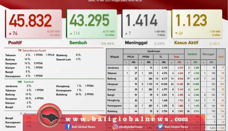 Pertambahan kasus terkonfirmasi positif Cobid-19 di Provinsi Bali pada Senin (10/5) tercatat 74 orang (65 orang melalui transmisi lokal, 8 PPDN dan 1 PPLN), sembuh 116 orang, dan 7 orang meninggal dunia.