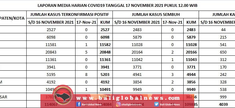 Pertambahan kasus terkonfirmasi positif Covid-19 di Provinsi Bali pada Rabu (17/11) tercatat 17 orang, pasien sembuh 11 orang dan nihil pasien meninggal dunia.