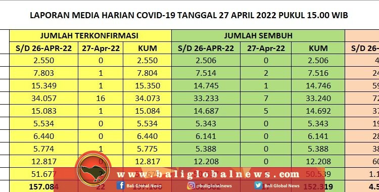 Pertambahan kasus terkonfirmasi positif Covid-19 di Provinsi Bali pada Rabu (26/4) tercatat 22 orang, pasien sembuh 17 dan nihil meninggal dunia.